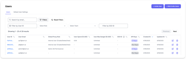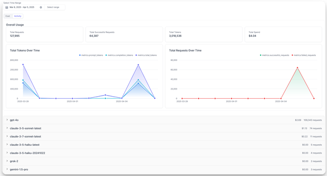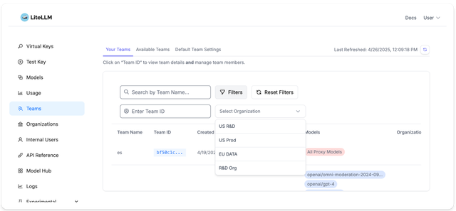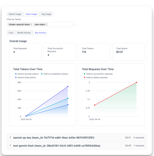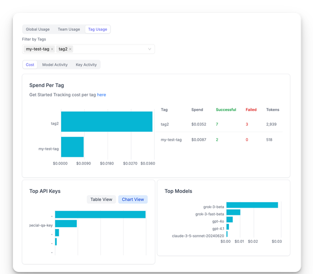 - Filter usage analytics, spend logs, and activity metrics by organization ID